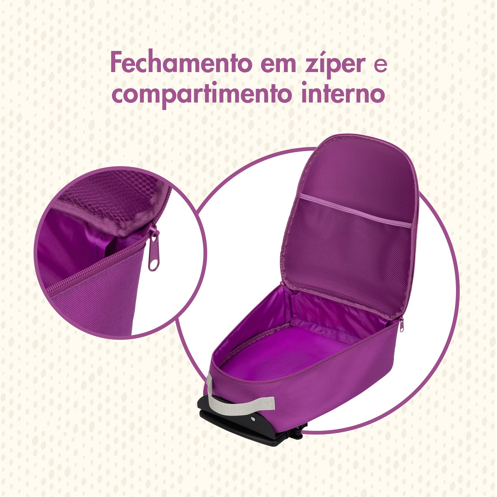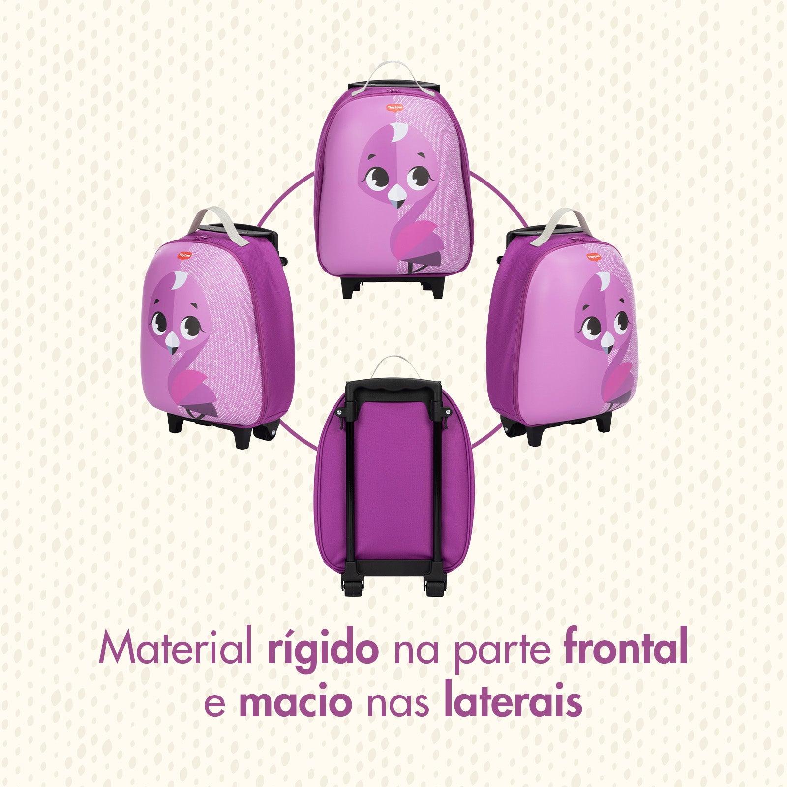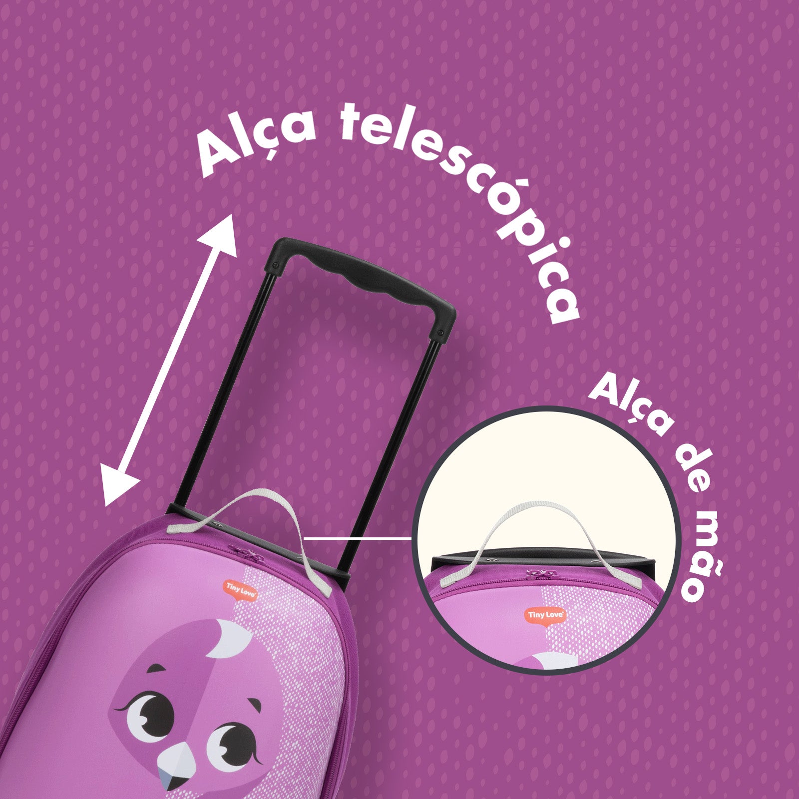 A mala de rodinhas foi pensada para se adaptar facilmente a rotina da criança. Com uma alça de mão, que ajuda a levar a mala em escadas e em terrenos diferentes e a rodinha que ajuda a criança a ter autonomia e poder levar a mala para onde quiser. Além disso, possui alça telescópica e apoio frontal, que permite que a mala fique em pé sozinha, fazendo com que ela seja super funcional. A mala possui fecho em zíper, que protege todos os pertences, mas sem dificultar para a criança abrir e fechar na hora que quiser.