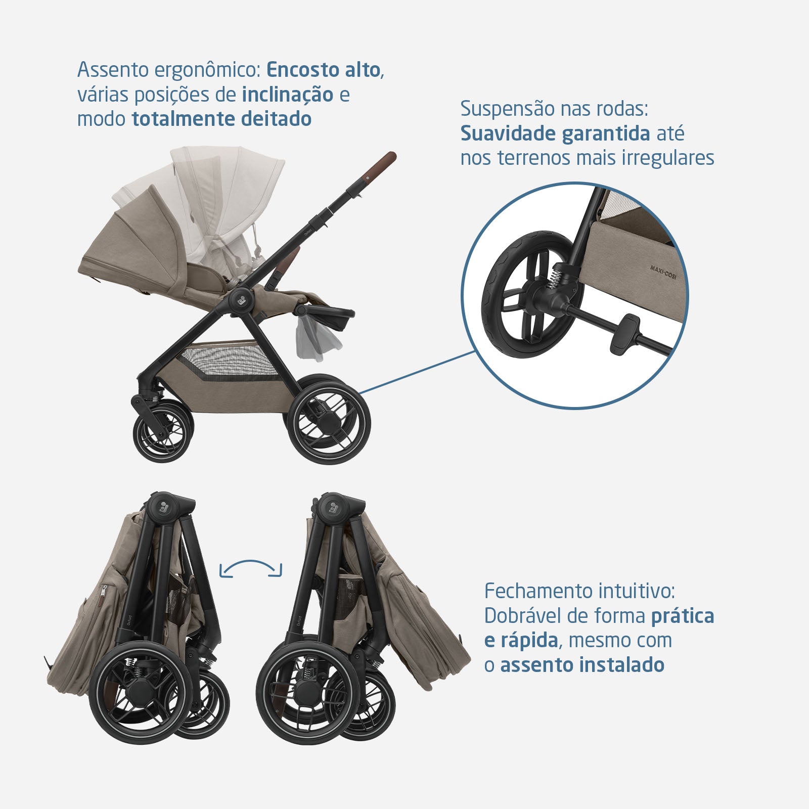 O Oxford foi projetado para acompanhar as rotinas das famílias com conforto e praticidade desde o nascimento até os 4 anos. Sua estrutura robusta com suspensão nas rodas proporciona passeios suaves mesmo em terrenos irregulares, enquanto o assento reclinável e o encosto alto garantem bem-estar em todas as posições — inclusive deitado, ideal para as sonecas durante os trajetos.