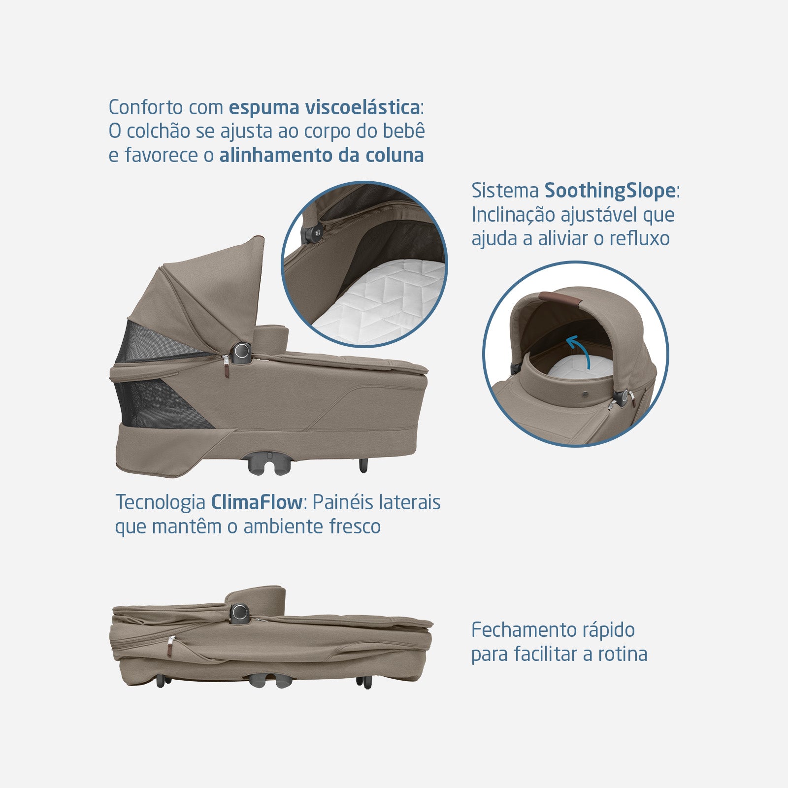 O moisés Sense foi desenvolvido para garantir conforto absoluto nos primeiros meses do bebê, tanto nos passeios quanto no descanso noturno. O colchão em espuma viscoelástica respirável se ajusta ao corpo do bebê, enquanto o sistema SoothingSlope permite inclinar a superfície para ajudar em casos de refluxo.