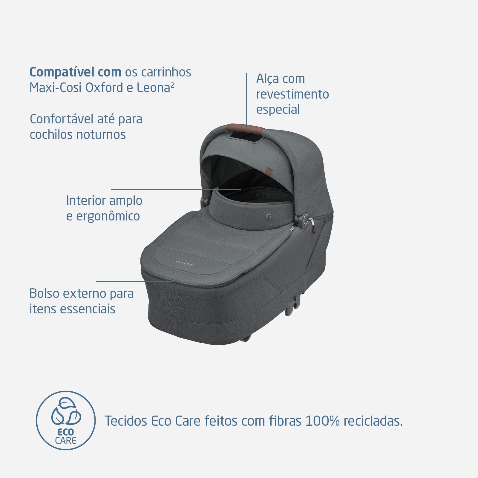Além do conforto térmico e ergonômico, o Sense traz detalhes funcionais como bolso externo para os pais, alça com acabamento em couro vegano e sistema de fechamento rápido. O colchão reversível e os tecidos reciclados Eco Care mostram que praticidade e sustentabilidade também caminham juntas desde o início.