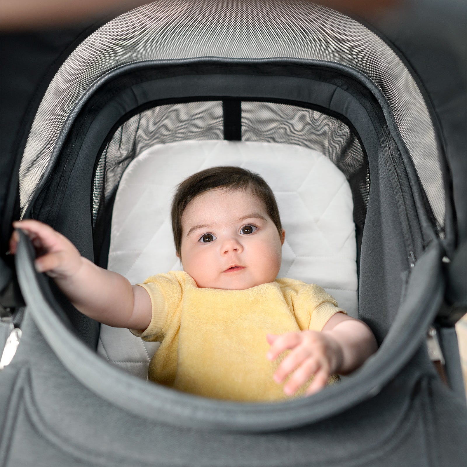 As aberturas laterais com tecnologia ClimaFlow proporcionam ventilação constante, mantendo o ambiente mais fresco. O interior amplo proporciona liberdade de movimento com sensação de acolhimento, ideal para sonecas prolongadas dentro ou fora de casa.