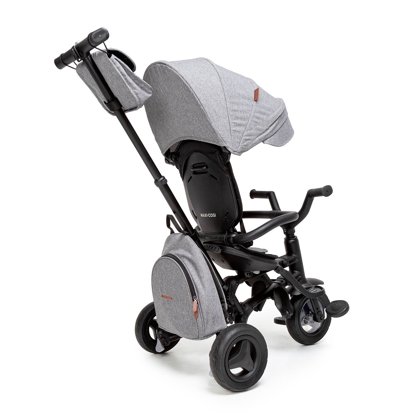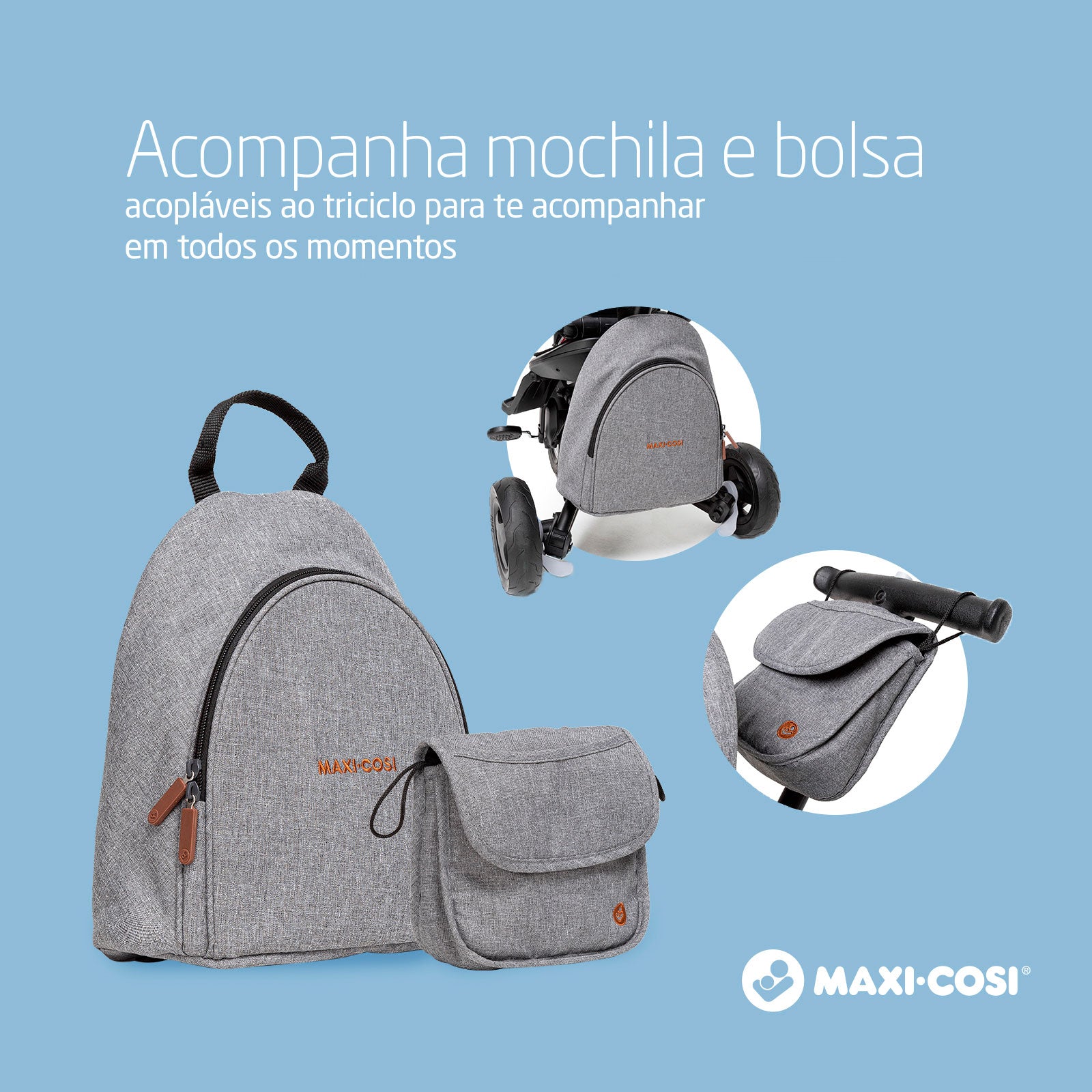 Para os pais guardarem os pertences, o triciclo vem com uma bolsinha e uma mochilinha exclusivas. Além de complementarem o design, elas são facilmente fixáveis na estrutura e permitem fácil acesso aos itens essenciais durante um passeio infantil, como lanches, fraldas e brinquedos.