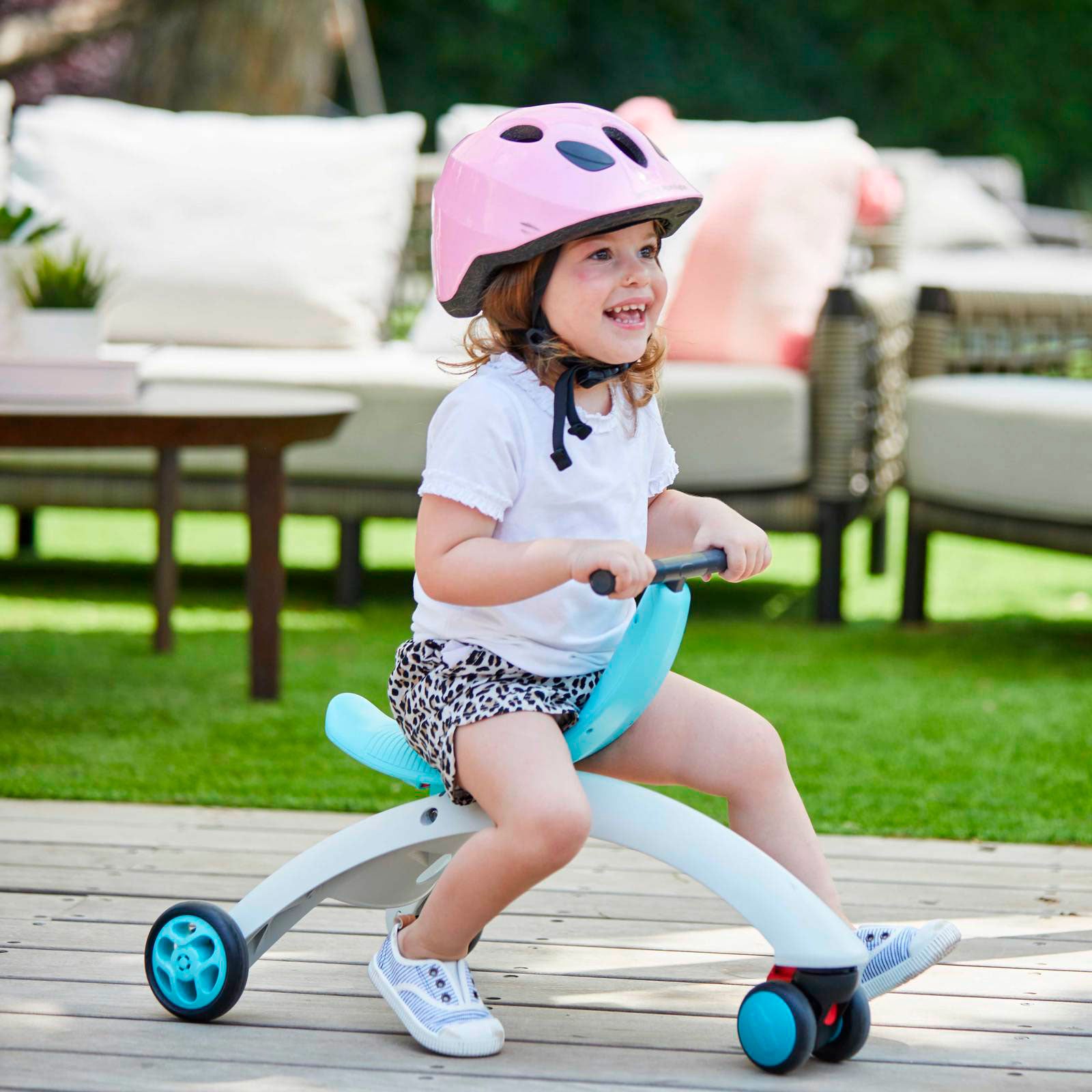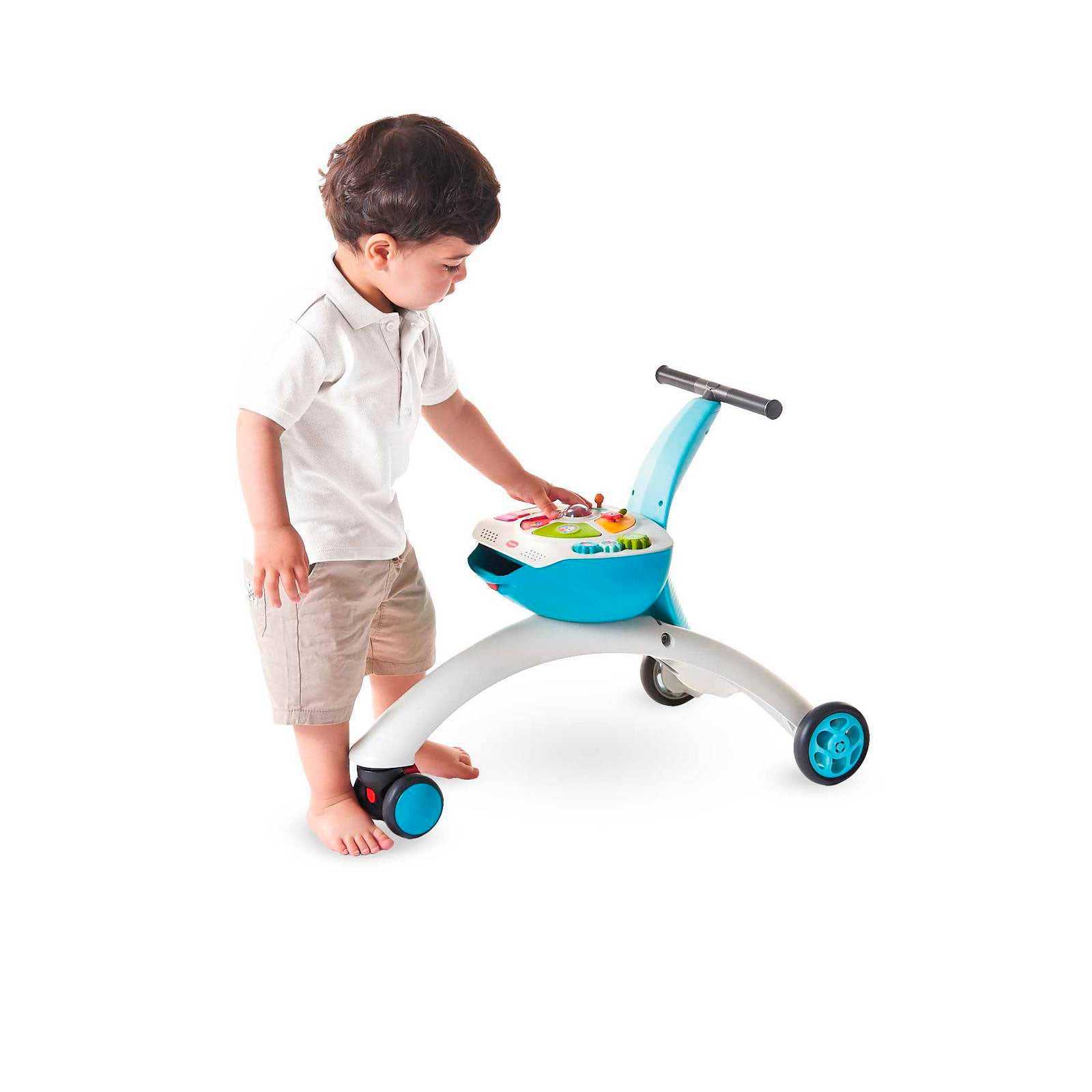 Passear: A criança pode se sentar no triciclo e usa os pés para avançar -- aprendendo a andar enquanto controla o equilíbrio.