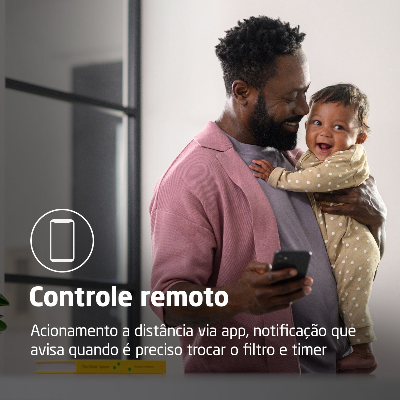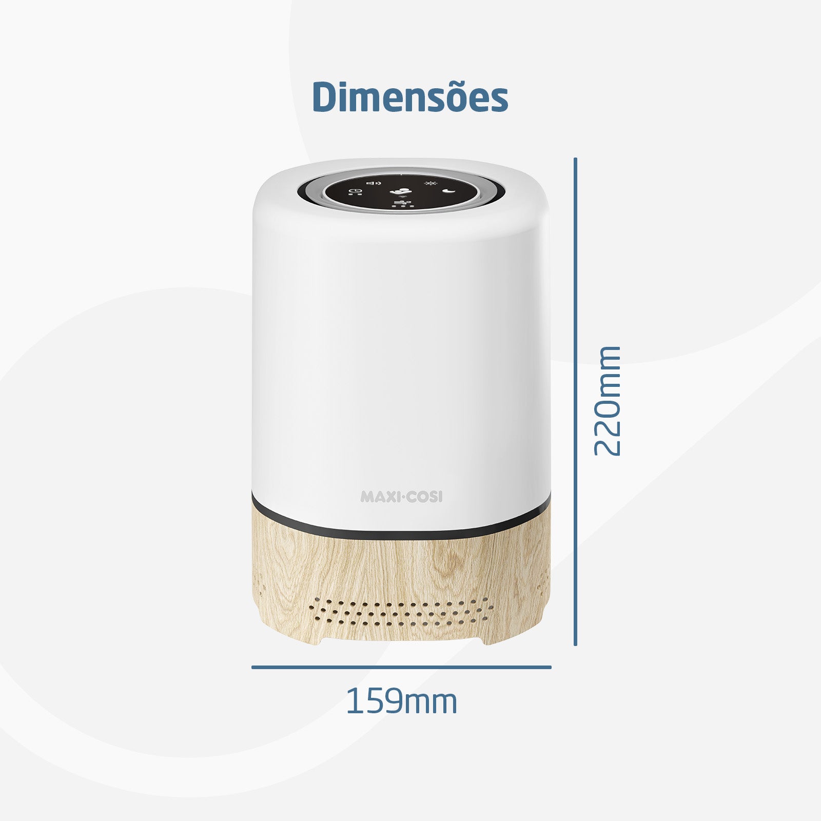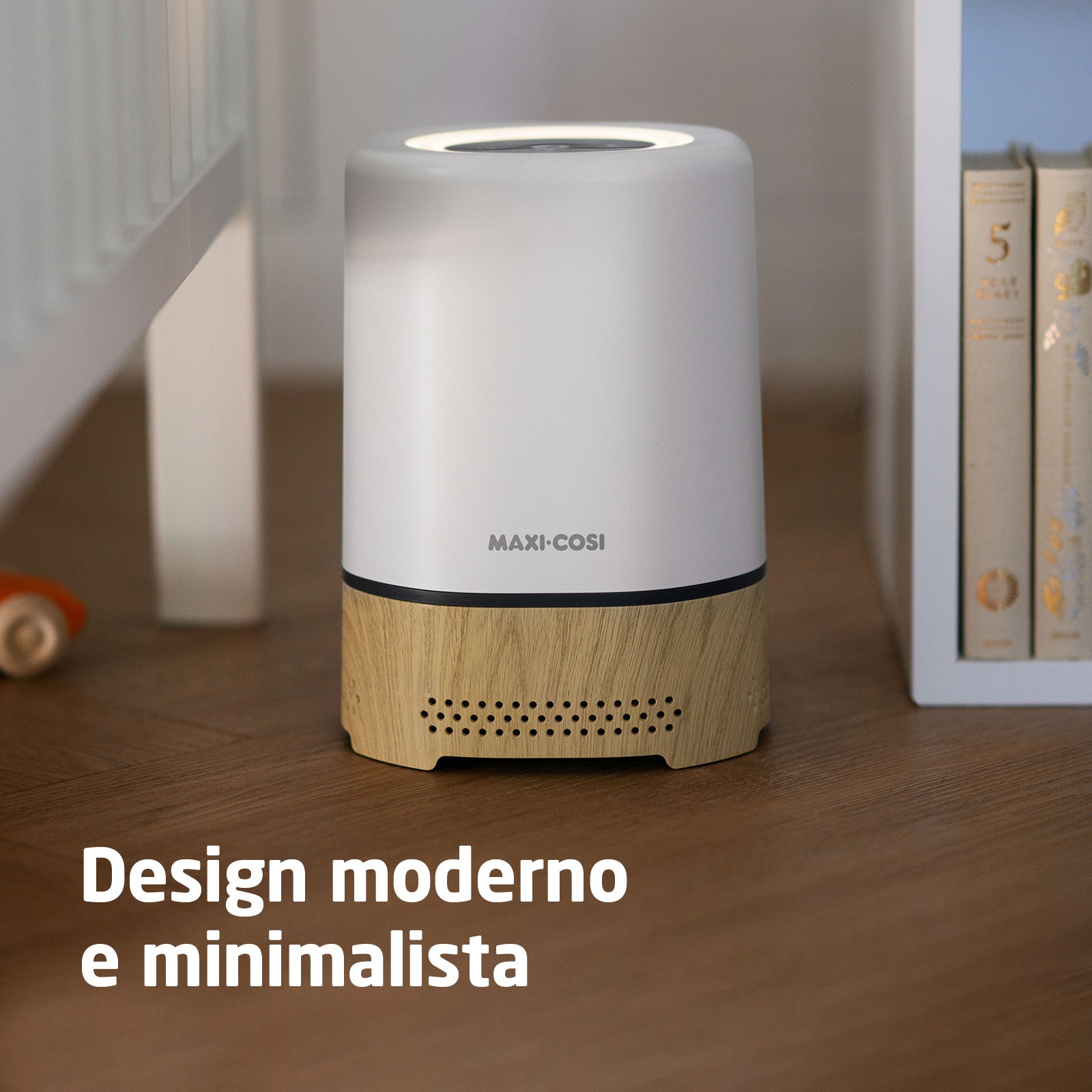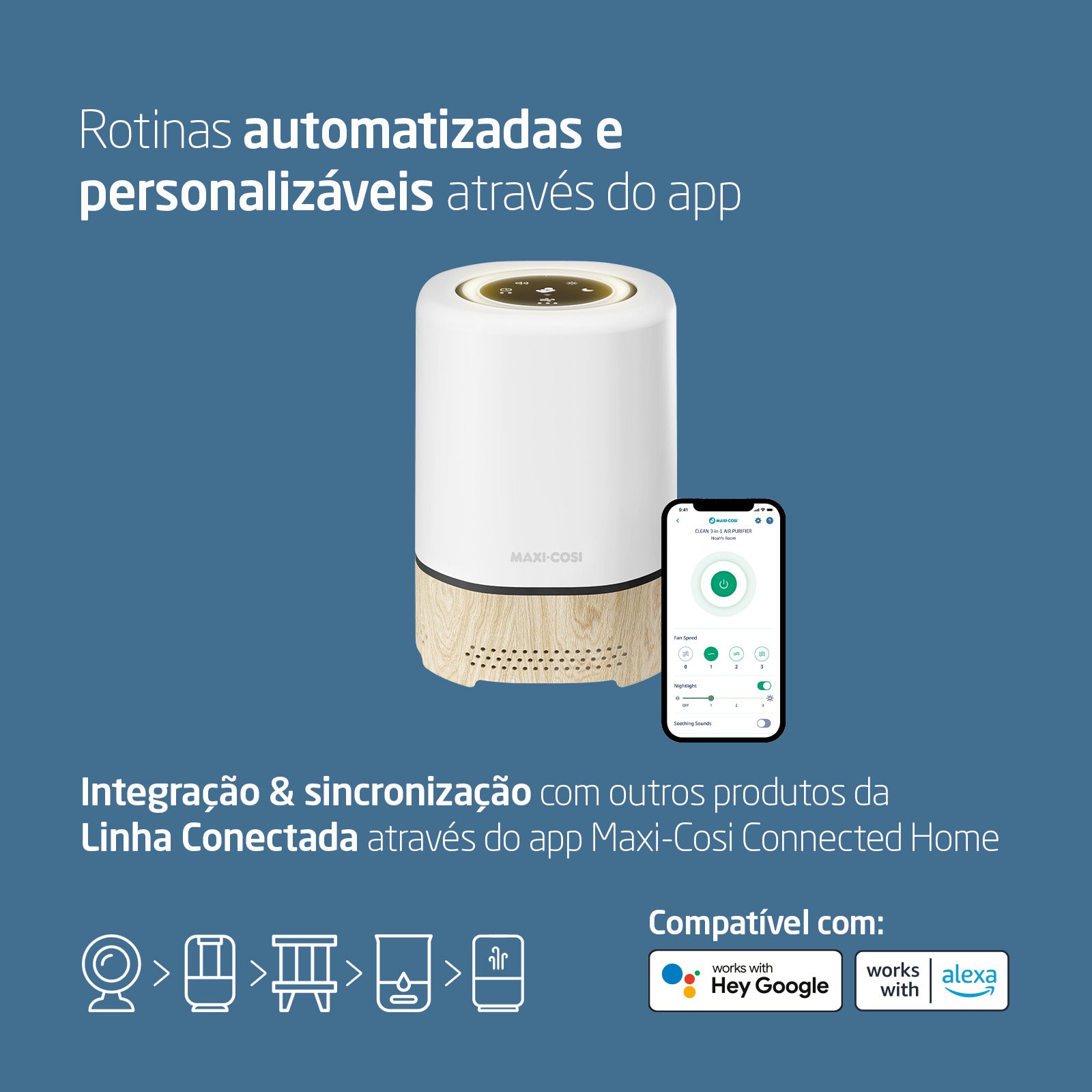 O Purificador de Ar Clean 3 em 1 possui design minimalista e moderno, combinando com qualquer tipo de decoração. Ele pode ser controlado a distância com o app Maxi-Cosi Connected Home, e em casas com conexões inteligentes, ele é compatível com Google e Alexa. Ele possui controles de segurança, como travamento infantil e um timer para conseguir controlar a duração dos sons e da luz.