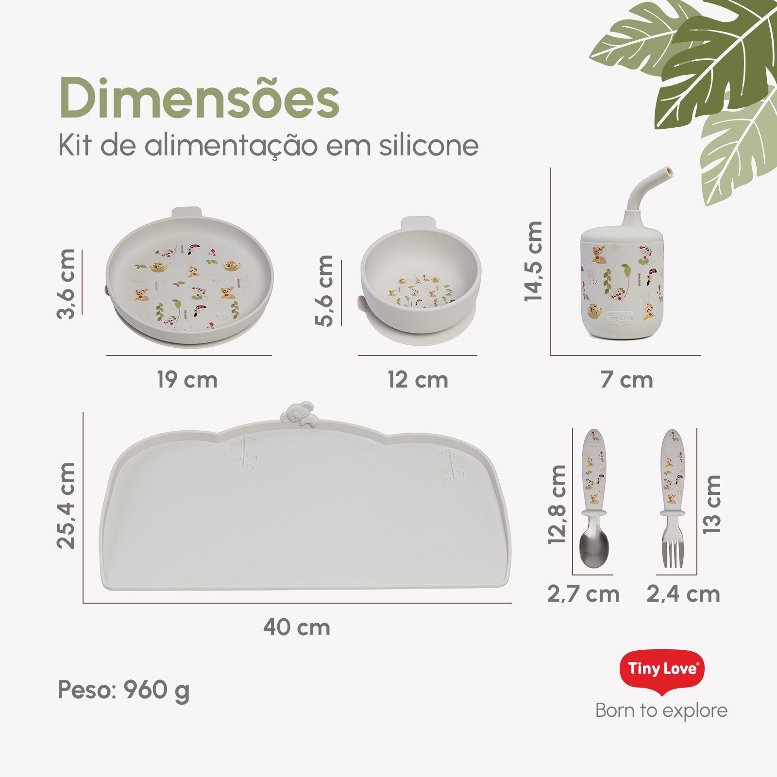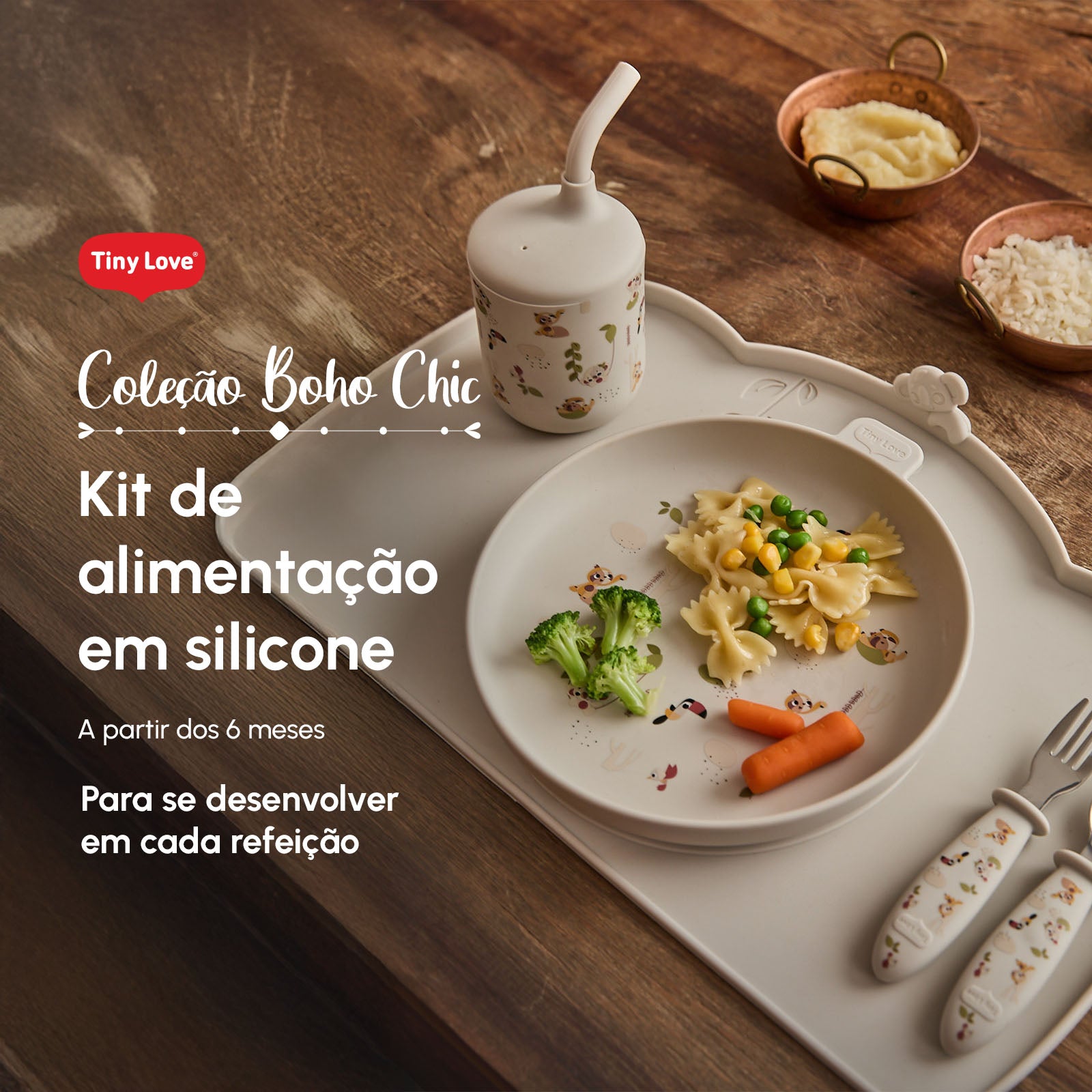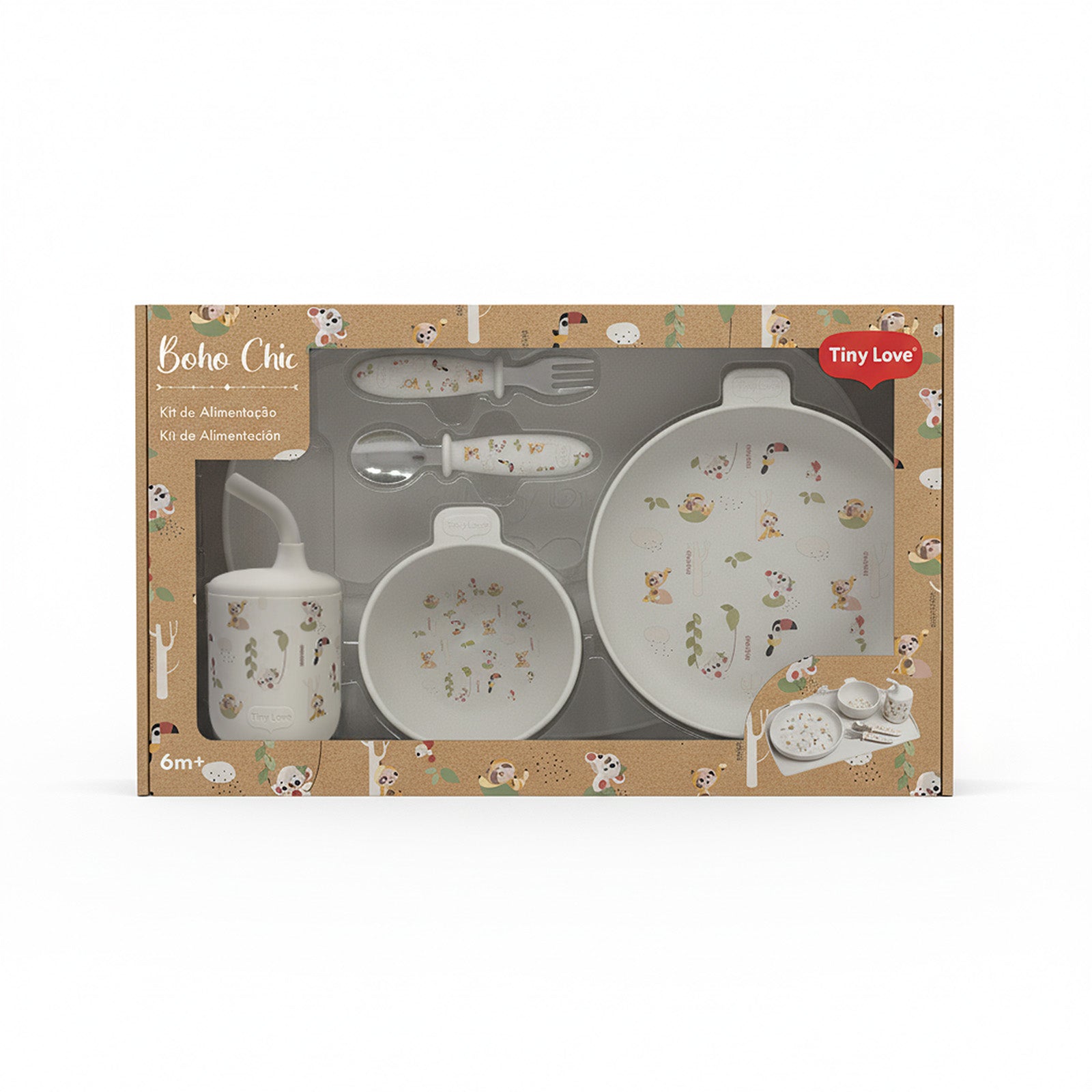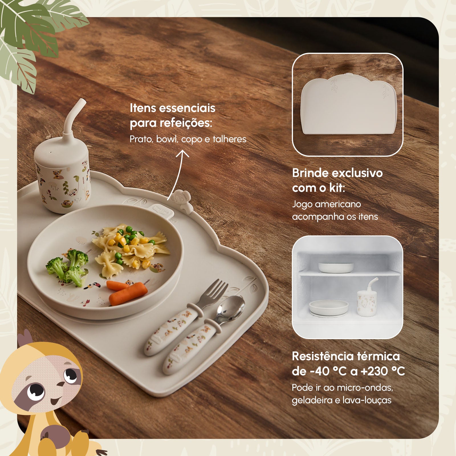 O kit é composto por seis itens essenciais: prato, bowl com ventosa, copo com canudo, colher e garfo com pontas de inox e cabos em silicone com design ergonômico e jogo americano como brinde exclusivo do conjunto completo. Com materiais 100% de grau alimentício, livres de BPA, e resistência a temperaturas de -40 °C a +230 °C, cada peça foi feita para acompanhar a rotina com segurança.