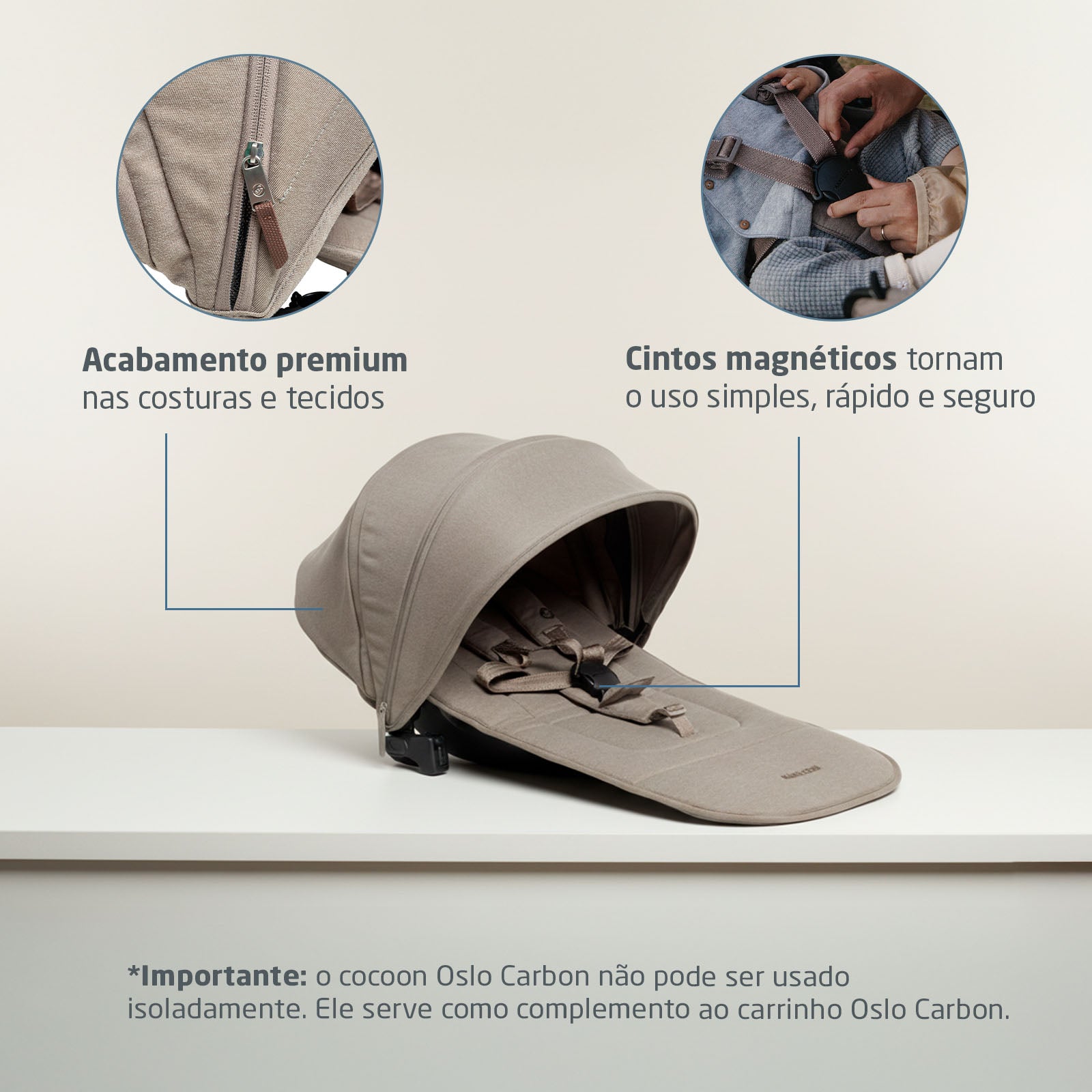 Leve e dobrável, o Cocoon acompanha a rotina dos pais, podendo permanecer instalado mesmo quando o carrinho é fechado, proporcionando mais praticidade sem perder a estética sofisticada que caracteriza o Oslo Carbon. É importante destacar, porém, que o Cocoon Oslo Carbon não pode ser usado isoladamente, funcionando unicamente na estrutura ao carrinho.